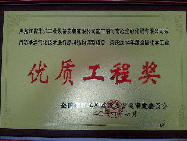 我公司施工的“河南心連心化肥有限公司采用潔凈煤氣化技術進行原料結構調整項目”榮獲全國化工工程建設質量獎評審委員會頒發的2014年度全國化學工業優質工程獎。
